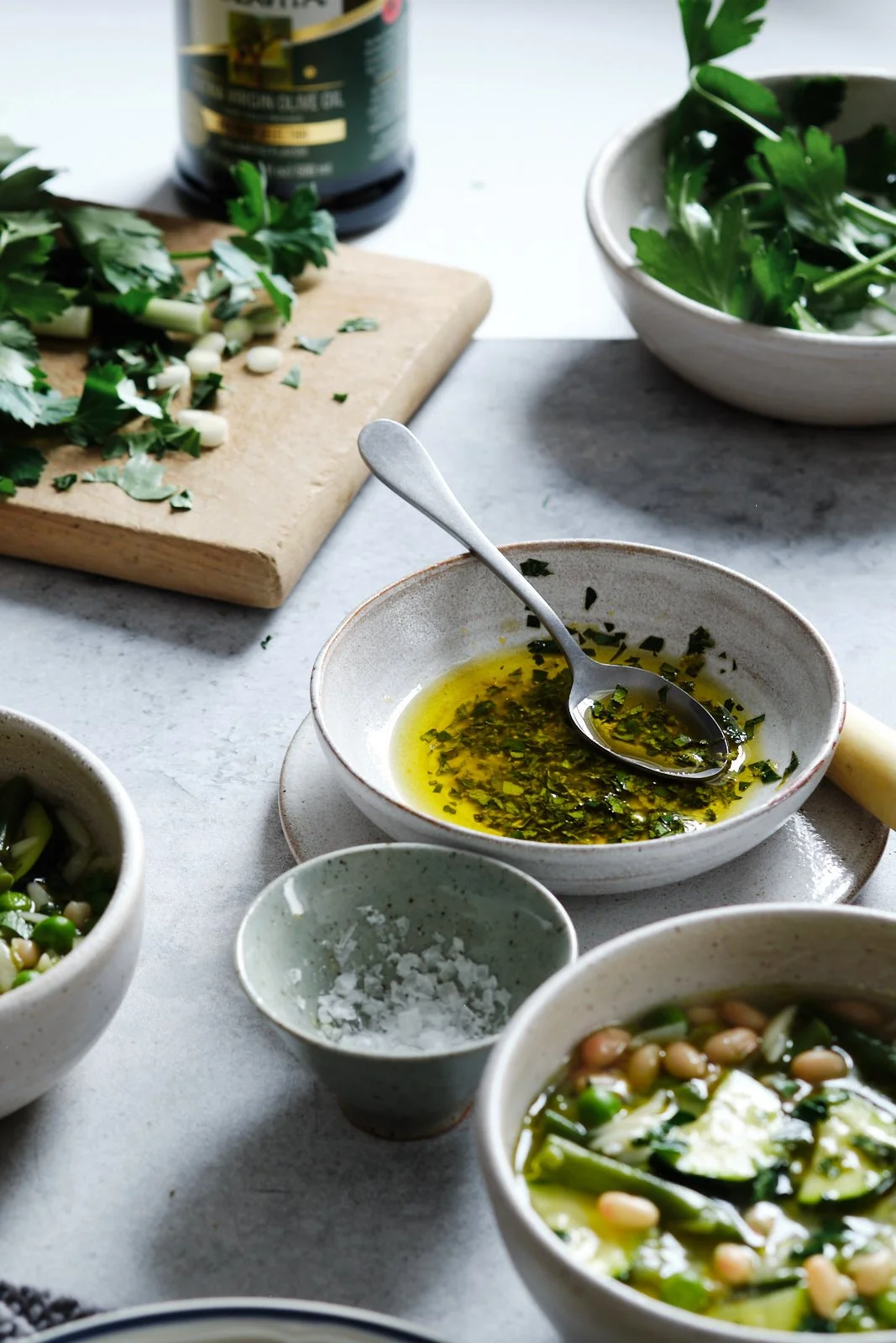 Green minestrone soup with herb, lemon, and olive oil sauce