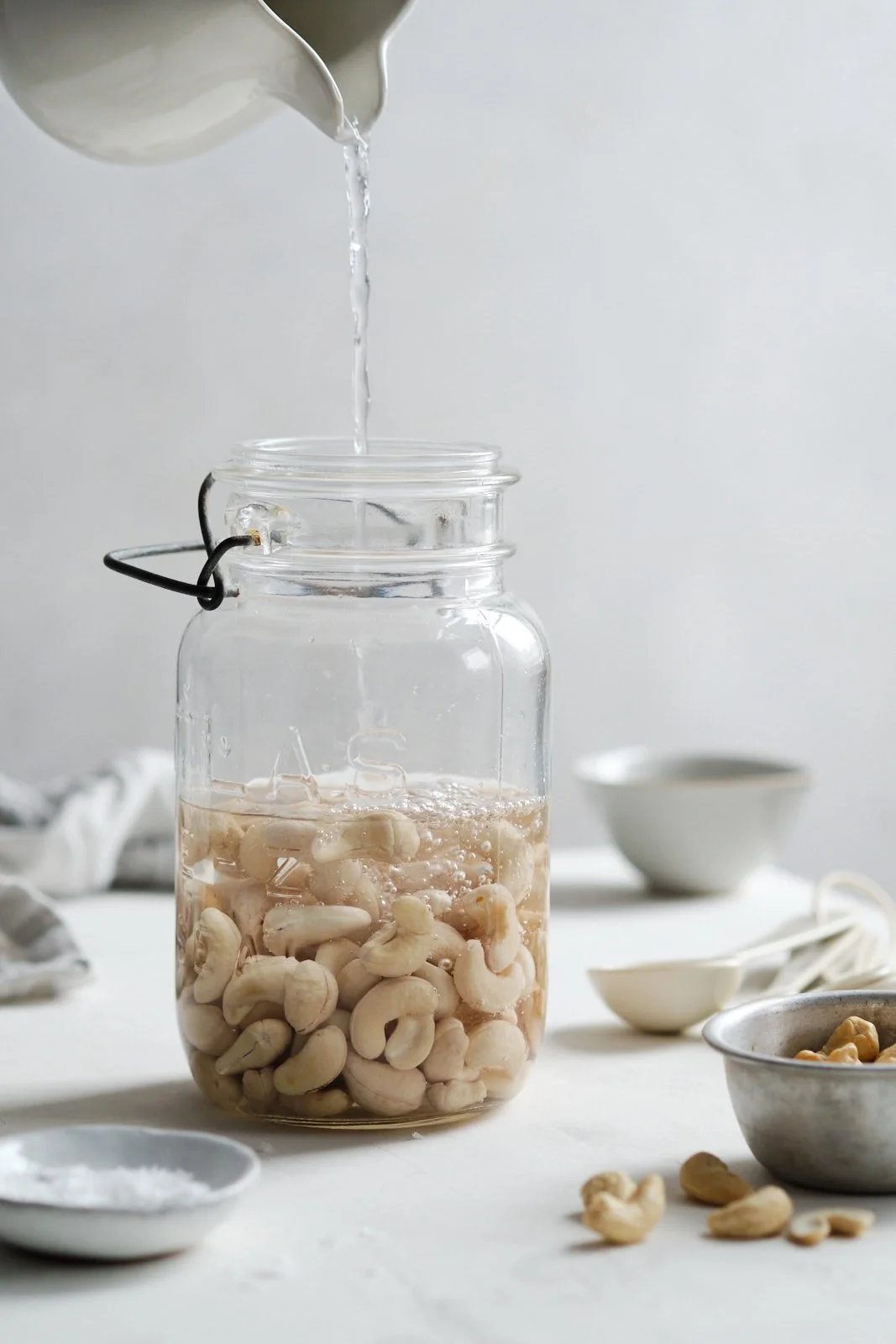 If using all cashews, place the cashews in a bowl and cover with cold water. Leave them at room temperature for 4-6 hours, or up to overnight. If using both cashews and almonds, soak the nuts separately, leaving the water-covered almonds on the counter for at least 8 hours, or overnight, as almonds need a longer soaking time.